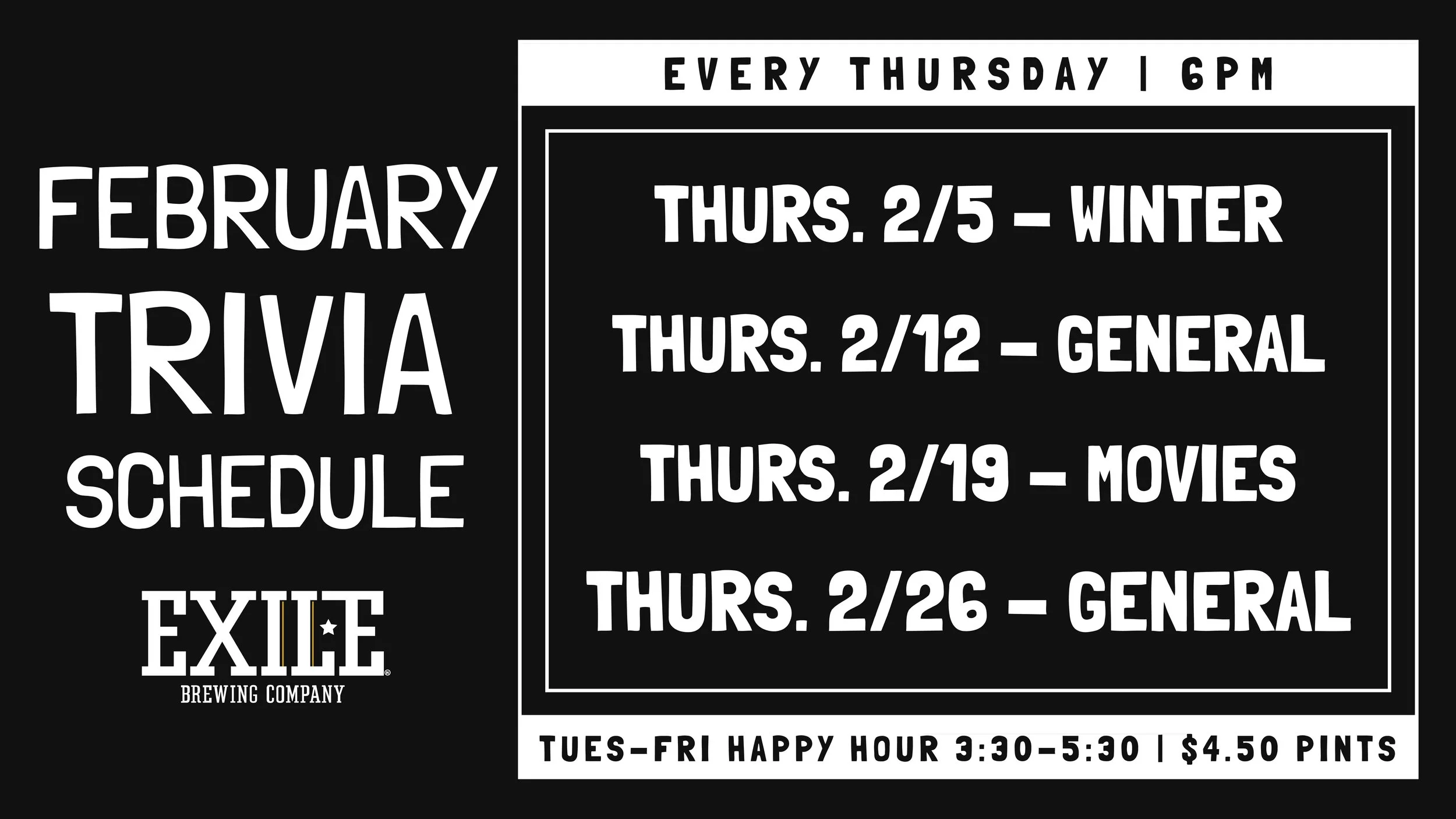 Come test your knowledge with our weekly Trivia, every Thursday at Exile with Trophy Husband Trivia.