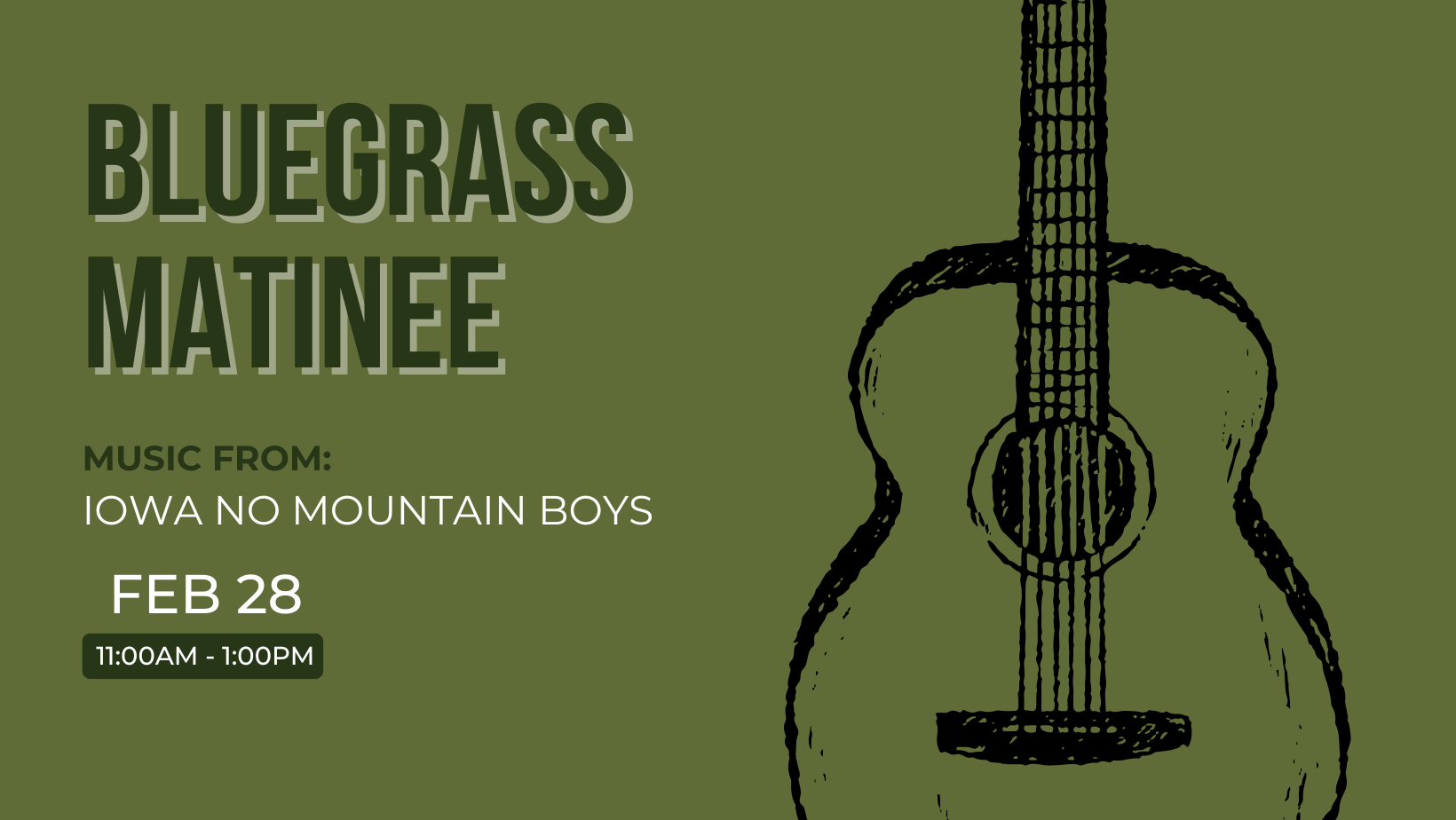 Join us on Saturday, February 28th from 11:00 AM - 1:00 PM for our Bluegrass Matinee with music from Iowa No Mountain Boys. Catch some live music and then be back home for your Saturday afternoon nap.