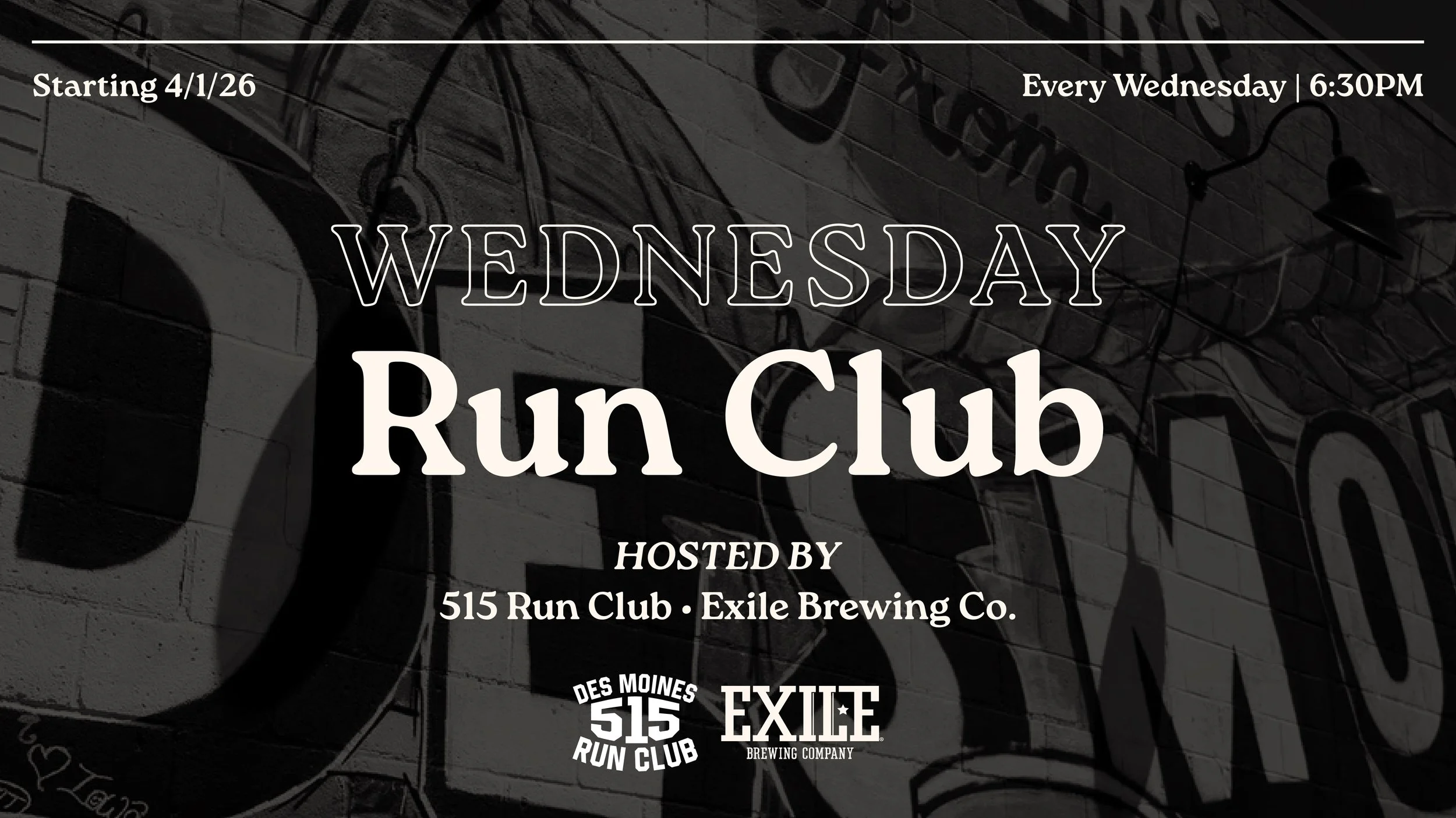 Wednesday Run Club Wednesday, April 8, 2026 6:30 PM 8:30 PM Exile Brewing Company 1514 Walnut Street Des Moines, IA, 50309 United States (map) Google Calendar ICS A weekly Run Club hosted by 515 Run Club at Exile Brewing Company!Meet at the Mural on 16th Street on the west side of Exile at 6:30PM every Wednesday. Enjoy our $12 Burger & Beer (or NA Beer) Basket deal after your run.